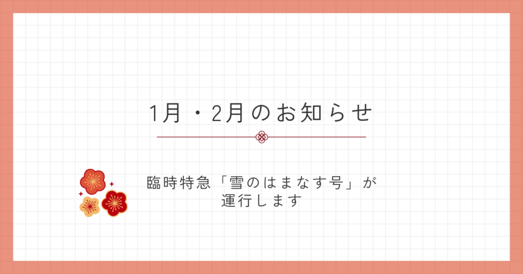 【1/31・2/1限定イベント】滝川・赤平・芦別を通る臨時特急「雪のはまなす号」が運行—札幌・旭川へ|中空知管内 公開日:2025.12.26 表示回数: 88 札幌〜富良野〜旭川を、乗り換えなしでつなぐ臨時特急「雪のはまなす号」が、2026年1月31日(土)・2月1日(日)の2日間だけ運行!滝川・赤平・芦別を経由して富良野へ抜けるルートで、札幌・旭川~中空知間の移動がぐっと快適に!車内にて沿線のご当地お菓子が配布予定! 札幌、旭川と中空知を結ぶ、冬の臨時特急。 2日間限定で運行する「雪のはまなす号」は、滝川・赤平・芦別を経由して走ります。 地元に帰るときにも、都市に向かうのにも直通で、ひとっとび。 ふだんは乗り換えが必要だったり、時間が読みにくかったりしますが、今回のイベントでは札幌~富良野~旭川間を乗り換えなしで移動することができます。 運行する車両は、キハ261系5000番代「はまなす編成」。富良野駅で進行方向の転換をして、終着駅へと向かいます。 また、下り列車の滝川→富良野間では、沿線からのおもてなしとして滝川・赤平・芦別・富良野のご当地お菓子の配布が予定されています(数量限定)! きっぷは「えきねっと」限定で、列車・席数・区間にも限りがあります。 2日間だけの運行なので、気になる方は早めに公式情報を確認してくださいね。 ■ イベント詳細 ■● 日時 2026年1月31日(土)、2月1日(日) ● 場所 札幌 〜 富良野 〜 旭川(函館線・根室線・富良野線経由) ● 運転時刻 下り(札幌→旭川)札幌 7:41発 → 富良野 9:42着(9:47発)→ 旭川 10:38着途中停車: 滝川・赤平・芦別・富良野・美瑛 上り(旭川→札幌)旭川 14:06発 → 富良野 15:12着(15:24発)→ 札幌 17:22着途中停車:美瑛・富良野・芦別・赤平・滝川※富良野駅で進行方向が変わります。 ● 料金(おとな1名・片道の例) 札幌〜富良野特急トクだ値1 3,800円 / 通常(運賃+指定席特急料金)5,440円 札幌〜美瑛特急トクだ値1 4,680円 / 通常6,690円 札幌〜旭川特急トクだ値1 4,990円 / 通常7,130円 ※「特急トクだ値1」は片道乗車券+指定席特急券のセット価格 ● 予約 要(えきねっと限定 / 列車・席数・区間限定) ● 発売期間 乗車日1か月前10:00 〜 前日23:50 ● 事前受付 発売開始日の1週間前14:00 〜 乗車日1か月前9:54 ふだんの移動にも、冬の旅行にも活躍しそうな2日限りのイベントです。ぜひ、この機会に臨時特急「雪のはまなす号」での移動を楽しんでください! 公式ホームページ